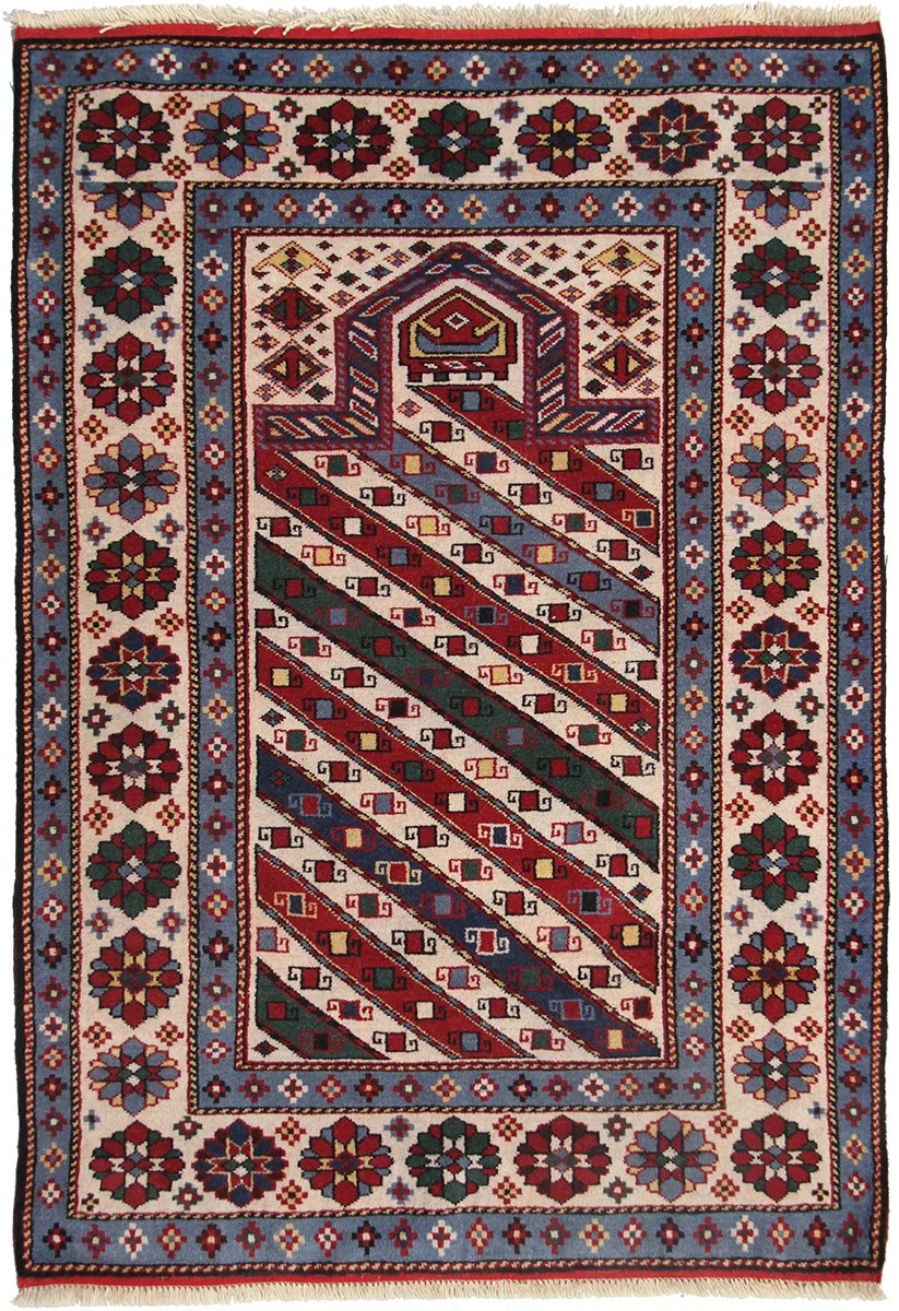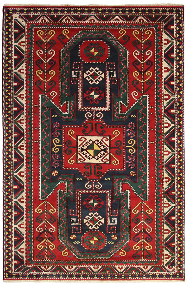 Gazakh carpet ornaments are geometric with simple composition. A large section of these carpets presents schematic depictions of geometric, plant, and animal motifs. Large central medallions characterise Gazakh carpets.